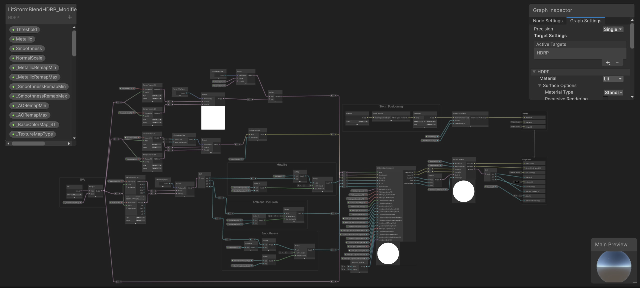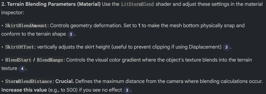 Shader Merging (HLSL/Graph): Manually merged Storm’s Texture-Based Blending logic into the project’s original Boxophobic and HDRP/Lit Shaders. This enabled a “one-click switch” compatibility, allowing art assets to seamlessly blend with terrain textures while preserving their original high-fidelity details.